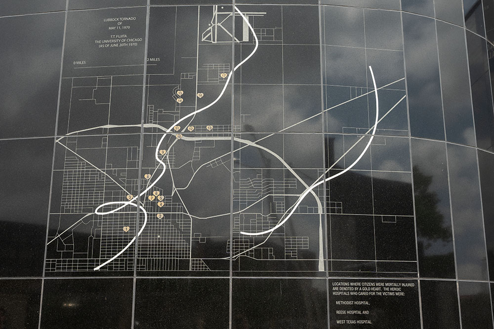 Da wir heute quasi keine Anfahrt ins Zielgebiet haben, entscheiden wir uns das Denkmal des verheerenden F5 Tornados vom 11.05.1970 von Lubbock anzuschauen. Auf beeindruckende Art und Weise hat man es geschafft, die Geschichte des Tornados zu erzählen. So erstrecken sich zwei ca. 6m hohe schwarze Wände, welche den Pfad des Tornados durch die Stadt widerspiegeln. In den Wänden steht die Geschichte des Tornados sowie Zitate von Zeugen und Helfern. Ein Gänsehaut-Moment! Viele kleine Details machen diesen Ort wirklich einzigartig und sollte auf jeden Fall besichtigt werden, wenn man durch Lubbock kommt.