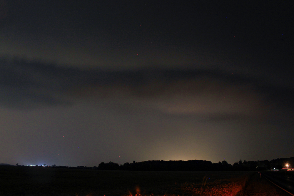 Gegen 22 / 23 Uhr fanden wir uns auf dem Völkerschlachtdenkmal ein, um vielleicht ein wenig Lightning Spotting zu betreiben, wenn nicht sogar mit Strukturen. Mit Blick aufs Radar und auf den Himmel mussten wir feststellen, dass der Outflow uns überlief und der stärkste Teil vom Regen verdeckt in Richtung Nord / Nordost zog. Die Bilder von Peter der freistehenden Rückseite des Südendes des Zellkomplexes erweckten Hoffnungen, wodurch wir uns südöstlich von Leipzig positionierten und die Gewitter abwarteten. Vorausgegangener Schirmregen und Neuentwicklungen reicherten die Luft so mit Feuchte an, so dass vor lauter Fractus Wolken kaum etwas von der Shelfcloud zu sehen war:
