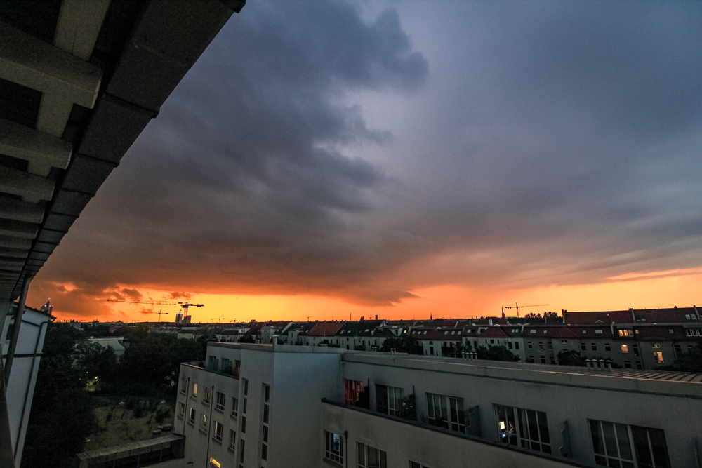 Die Lage hatte sich soweit geändert, so dass tägliches Geblubber vom Erzgebirge / Vogtland ausging und sich dann nach Norden hin verlagerte. Am Donnerstag Abend trafen sich die Leipziger Meteos / Studierenden zum Stammtisch in privaten Räumen, als Einstand als Chasingspot. Aus Südwesten zog seehr langsam eine Shelfcloud auf Leipzig zu, welche auf magische Art und Weise (Ironiieee) in Richtung Stadtgebiet immer weiter abbaute. Die Reste zogen über Leipzig und erzeugten mit der rückseitig untergehenden Sonne eine sehr nette Farbszenerie. Blick nach Südwesten, als die Shelfreste die Stadt überqueren: