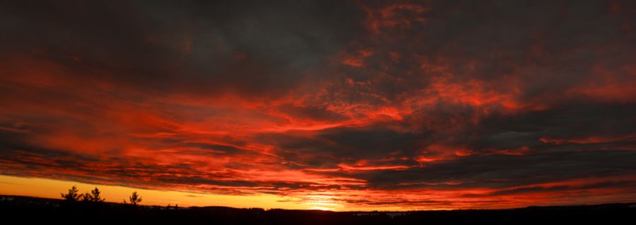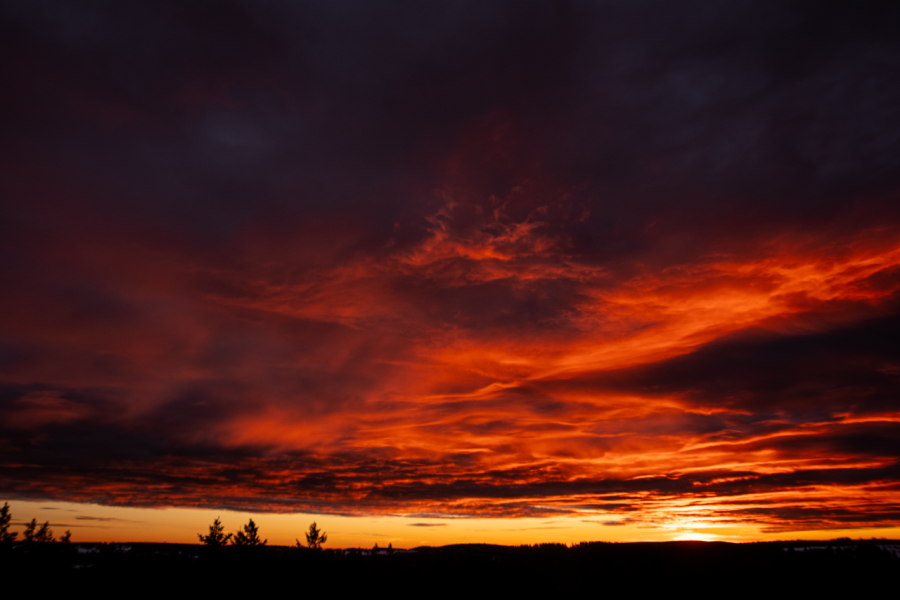 Gestern gab es vor der heranziehenden Warmfront einen recht farbenfrohen Tag, vom Morgenrot bis zum Abendrot mit roten Regenbogen,