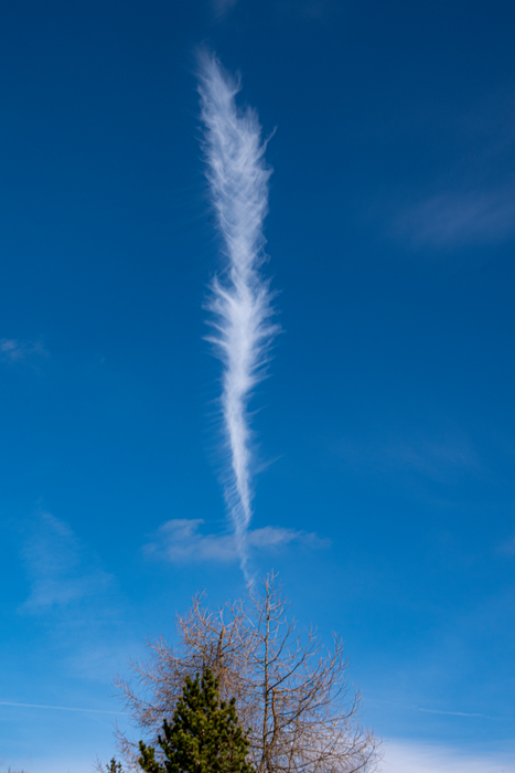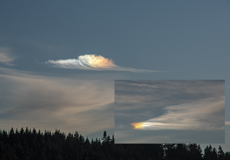 Anfangs ein alternder, aber zäher Kondensstreifen (Cirrus homomutatus), welcher dann nach und nach von tiefem (5800 m) Cirrocumulus lenticularis undulatus eingehüllt wurde, dazu leichtes Irisieren.